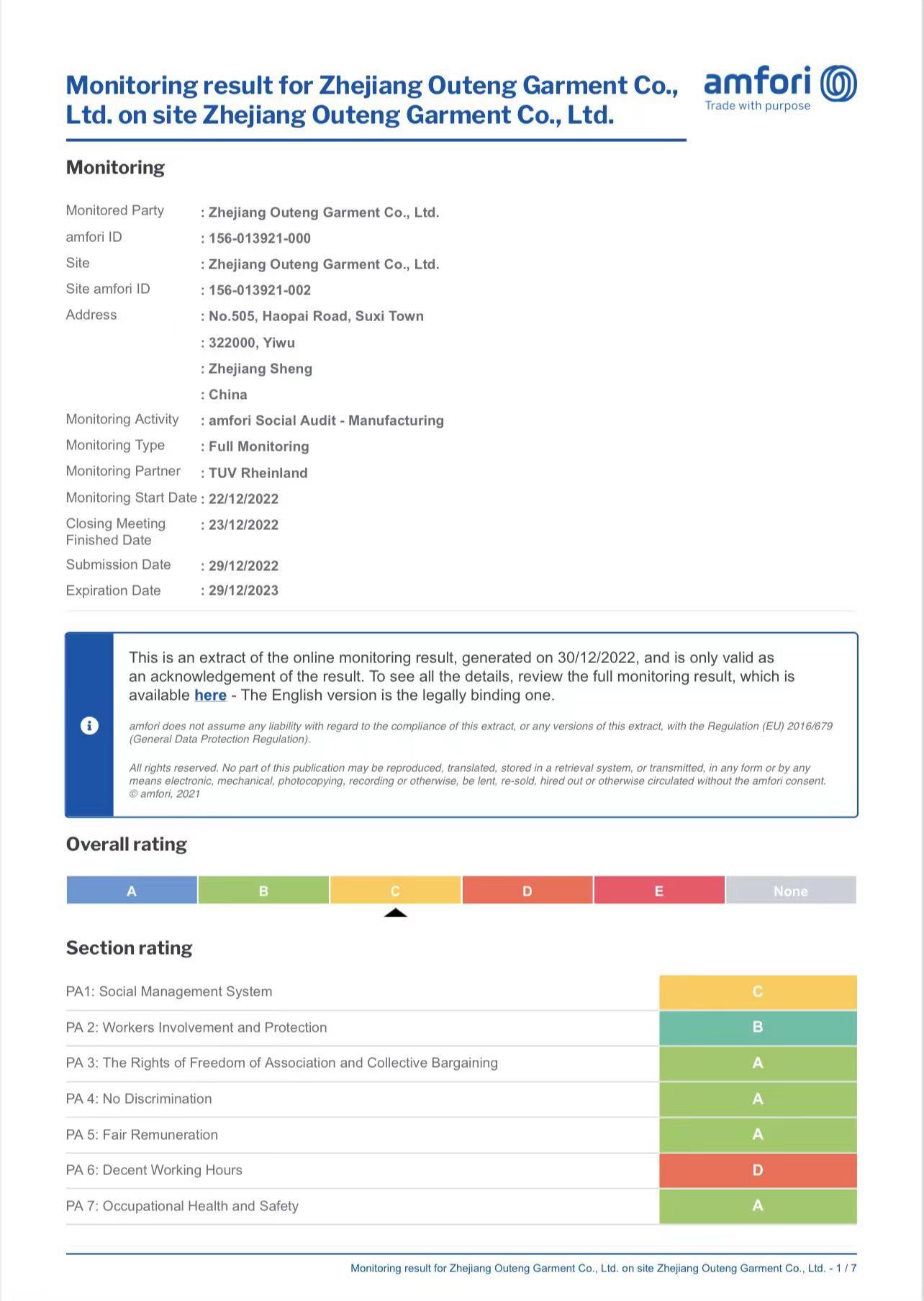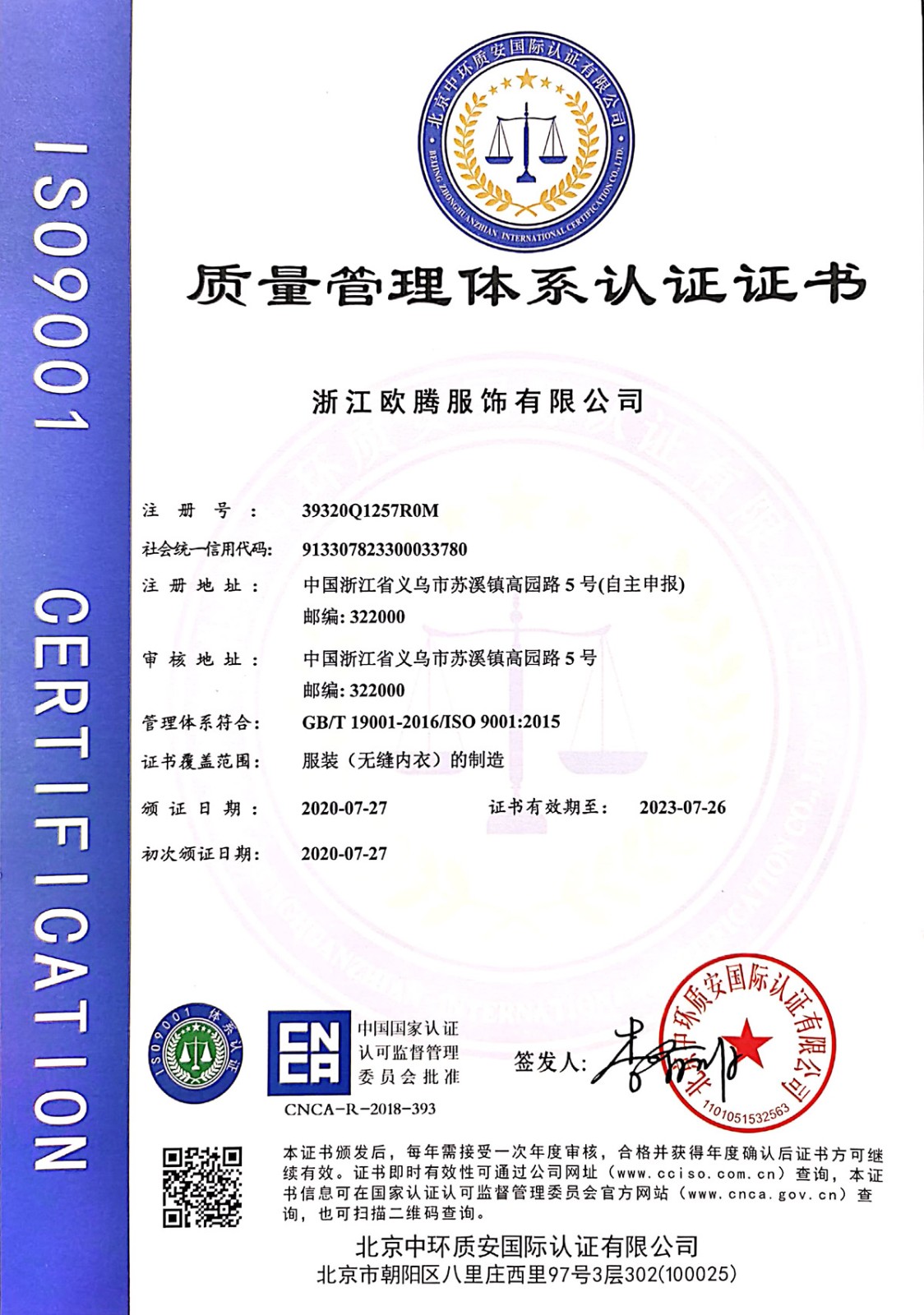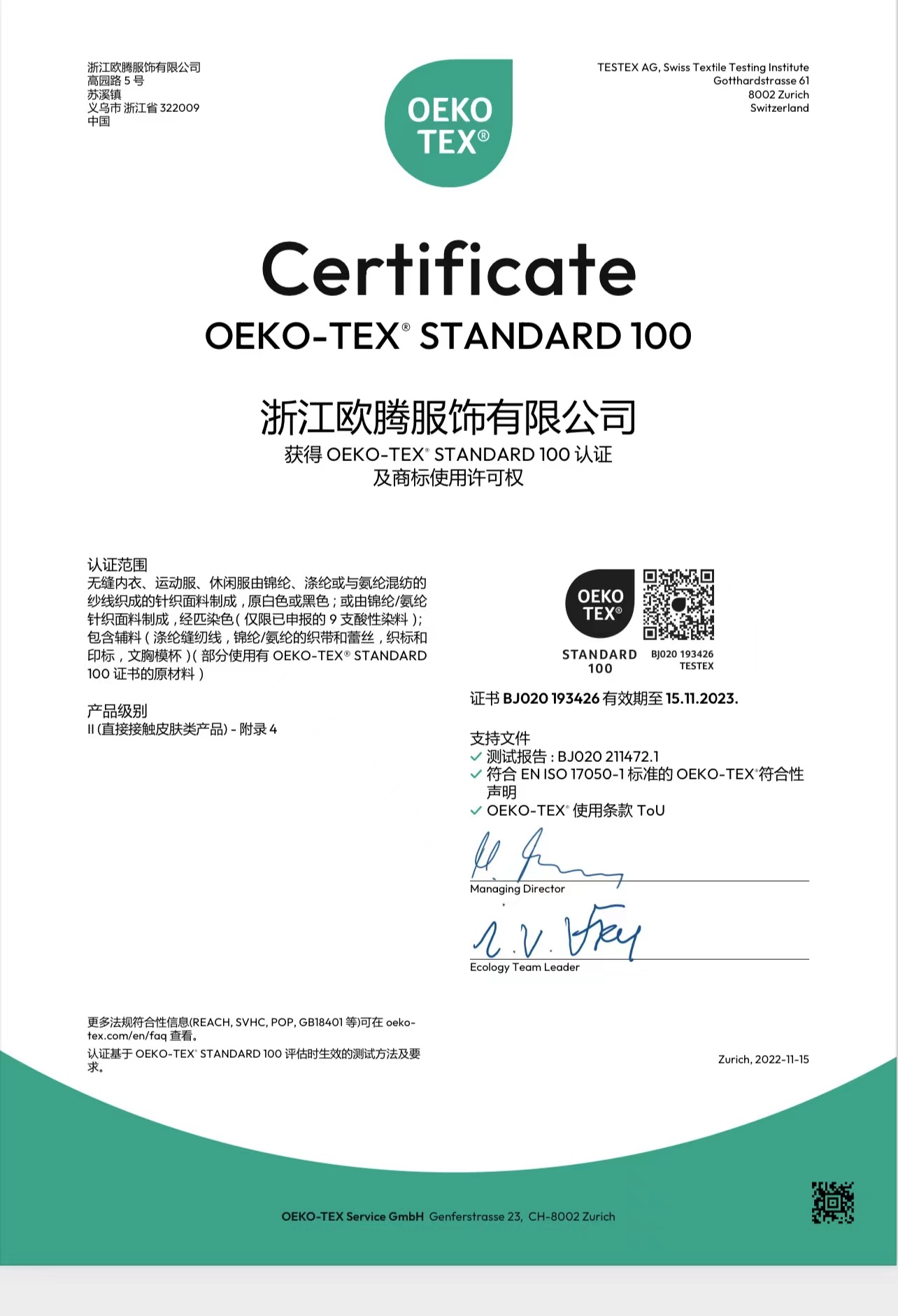 浙江歐騰服飾有限公司位于世界小商品之都-義烏。創(chuàng)立于2015年,是一家專業(yè)生產(chǎn)無縫針織運(yùn)動服飾和內(nèi)衣的工貿(mào)一體企業(yè),擁有自主出口權(quán)。 工廠的占地面積約16000平方米 ,引進(jìn)了大型圣東尼、高騰等多種先進(jìn)的制衣設(shè)備300余臺。月產(chǎn)能可達(dá)90萬件。 歐騰服飾每年投入近百萬資金打樣開發(fā)新產(chǎn)品,有著一支高素質(zhì)設(shè)計、技術(shù)員工隊伍。工廠先后通過了ISO 9001質(zhì)量管理體系認(rèn)證、BSCI認(rèn)證、GRS認(rèn)證、OEKO-TEX國際生態(tài)紡織品認(rèn)證等多項專利檢測報告。可提供OEM&ODM服務(wù)。歐騰服飾以一套完整、科學(xué)的質(zhì)量管理體系,生產(chǎn)的服裝從原材料紗線到成衣,質(zhì)量完全能夠滿足國內(nèi)、國際質(zhì)量要求。獲得了客戶一致好評。工廠先后獲得省科技型企業(yè)、國家高新企業(yè)、義烏市誠信講信用單位、規(guī)上企業(yè)、信用AAA級等榮譽(yù)。